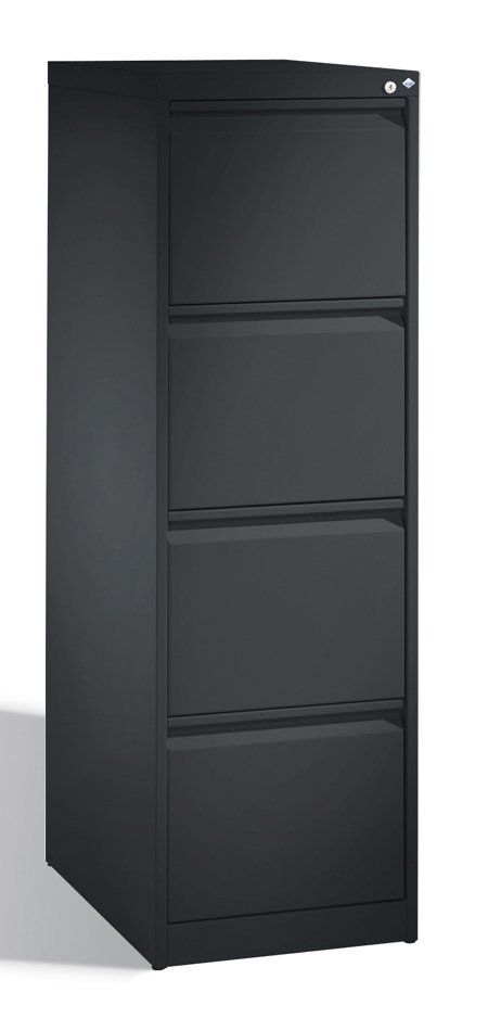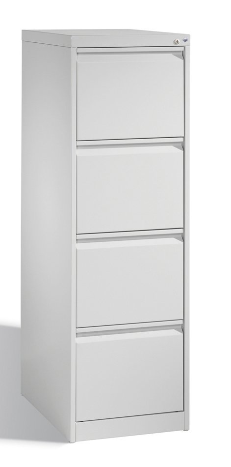 Metalowa szafka kartotekowa z czterema szufladami na dokumenty lub segregatory wiszące w formacie A4 lub Foolscap, szerokość 413 lub 470, wysokość 1321, głębokość 622 mm, zamek centralny, różne kolory. W magazynie w kolorze jasnoszarym, beżowym i białym.