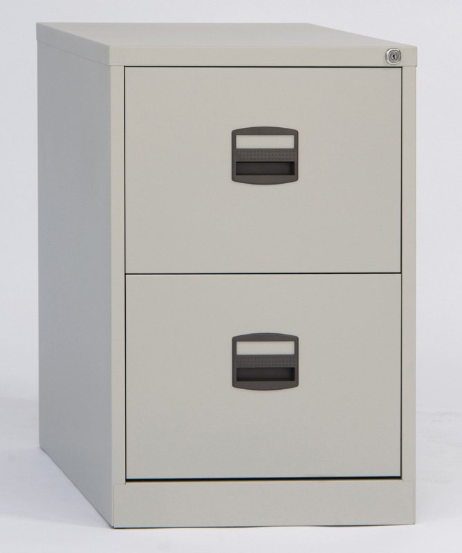 Metalowa szafka kartotekowa z dwiema szufladami na dokumenty lub segregatory wiszące w formacie A4 lub Foolscap, szerokość 413 lub 470, wysokość 711, głębokość 622 mm, zamek centralny, różne kolory.