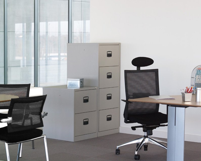 Metalowa szafka kartotekowa z dwiema szufladami na dokumenty lub segregatory wiszące w formacie A4 lub Foolscap, szerokość 413 lub 470, wysokość 711, głębokość 622 mm, zamek centralny, różne kolory.