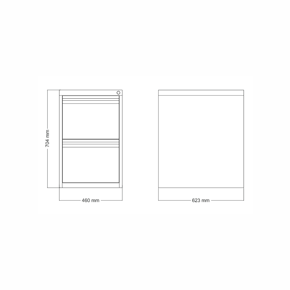 Metalowa szafka kartotekowa z dwiema szufladami na dokumenty i segregatory wiszące w formacie Folio i A4, szerokość 460, wysokość 704, głębokość 623 mm. Inne kolory na zamówienie.