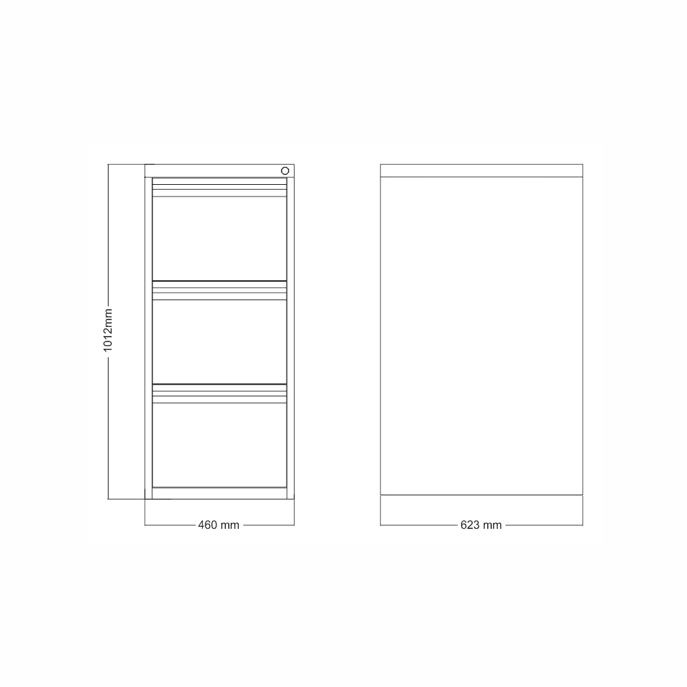 Metalowa szafka kartotekowa z trzema szufladami na dokumenty i segregatory wiszące w formacie Folio i A4, szerokość 460, wysokość 1012, głębokość 623 mm. Inne kolory na zamówienie.