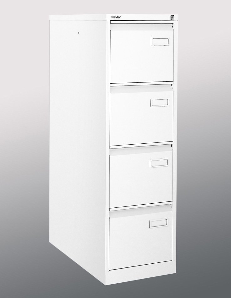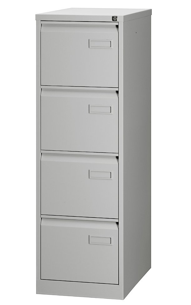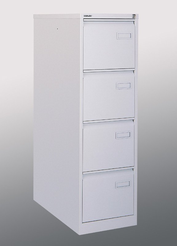 Metalowa szafka kartotekowa z czterema szufladami na dokumenty lub segregatory wiszące w formacie A4 lub Foolscap, szerokość 413 lub 470, wysokość 1321, głębokość 622 mm, zamek centralny, różne kolory. W magazynie w kolorze jasnoszarym, beżowym i białym.