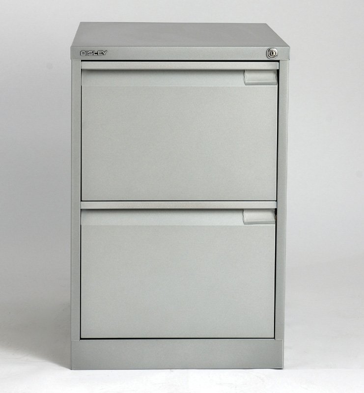 Metalowa szafka kartotekowa z dwiema szufladami na dokumenty lub segregatory wiszące w formacie A4 lub Foolscap, szerokość 413 lub 470, wysokość 711, głębokość 622 mm, zamek centralny, różne kolory. Dostępne w kolorze jasnoszarym lub beżowym (szerokość 413 mm).