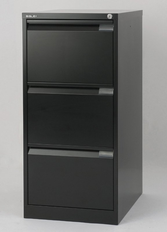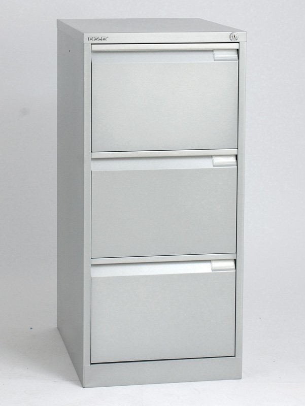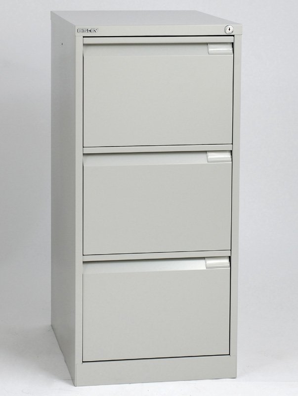 Metalowa szafka z trzema szufladami na dokumenty lub segregatory wiszące w formacie A4 lub Foolscap, szerokość 413 lub 470, wysokość 1016, głębokość 622 mm, zamek centralny, różne kolory. Dostępny w kolorze jasnoszarym lub beżowym (szerokość 413 mm).