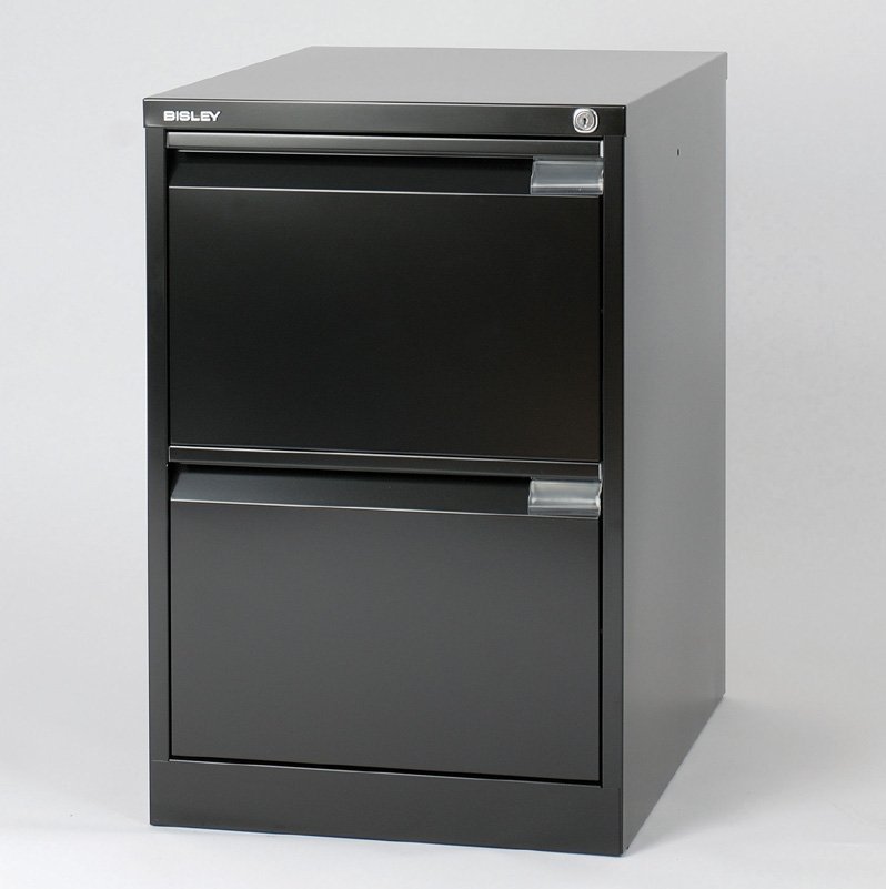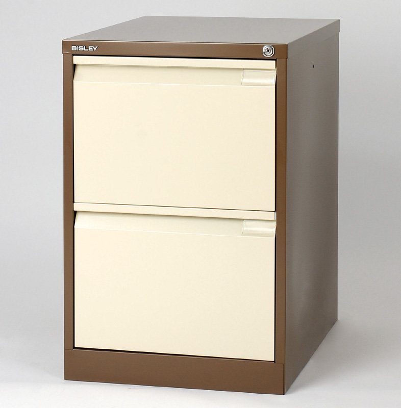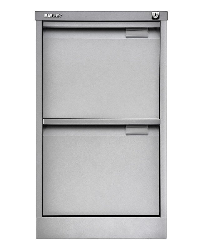 Metalowa szafka kartotekowa z dwiema szufladami na dokumenty lub segregatory wiszące w formacie A4 lub Foolscap, szerokość 413 lub 470, wysokość 711, głębokość 622 mm, zamek centralny, różne kolory. Dostępne w kolorze jasnoszarym lub beżowym (szerokość 413 mm).