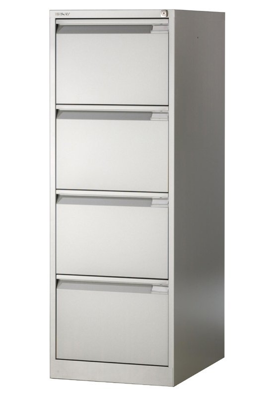 Metalowa szafka kartotekowa z czterema szufladami na dokumenty lub segregatory wiszące w formacie A4 lub Foolscap, szerokość 413 lub 470, wysokość 1321, głębokość 622 mm, zamek centralny, różne kolory. W magazynie w kolorze jasnoszarym, beżowym i białym.