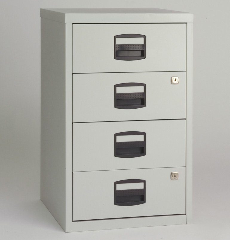 Metalowa szafka na dokumenty czteroszufladowa PFA4S, szerokość 413, wysokość 672, głębokość 400 mm, różne kolory. UWAGA - nadaje się tylko do ograniczonego użytku - np. do domowego biura. Przy pełnej pracy biurowej szafka na dokumenty ma krótszą żywotność.