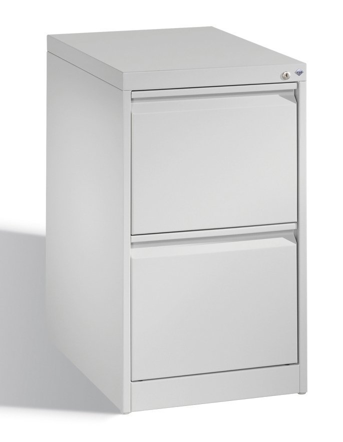 Metalowa szafka kartotekowa z dwiema szufladami na dokumenty lub segregatory wiszące w formacie A4 lub Foolscap, szerokość 413 lub 470, wysokość 711, głębokość 622 mm, zamek centralny, różne kolory. Dostępne w kolorze jasnoszarym lub beżowym (szerokość 413 mm).