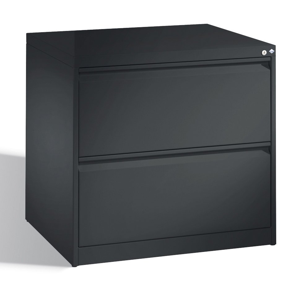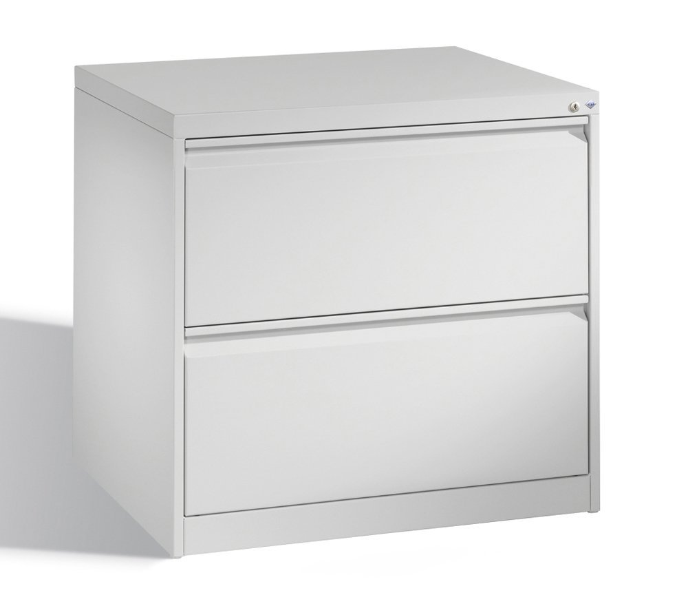 Metalowa szafka kartotekowa z dwiema szufladami na dokumenty lub segregatory wiszące w formacie A4 lub Foolscap, szerokość 413 lub 470, wysokość 711, głębokość 622 mm, zamek centralny, różne kolory.