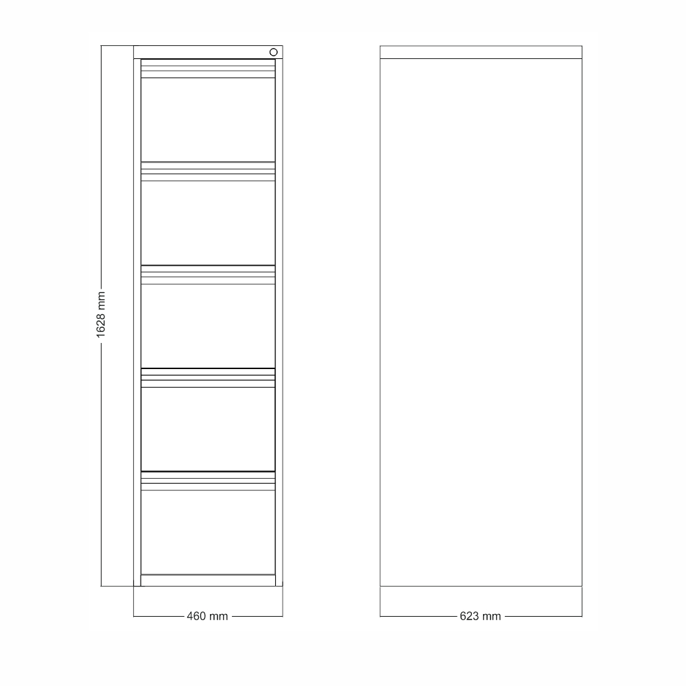 Metalowa szafka na dokumenty w formacie A4 z pięcioma szufladami. Wysokość 1628 x szerokość 405 x głębokość 623 mm. Pełny wysuw szuflad, blokada przed wysunięciem kilku szuflad jednocześnie. Inne kolory na zamówienie.
