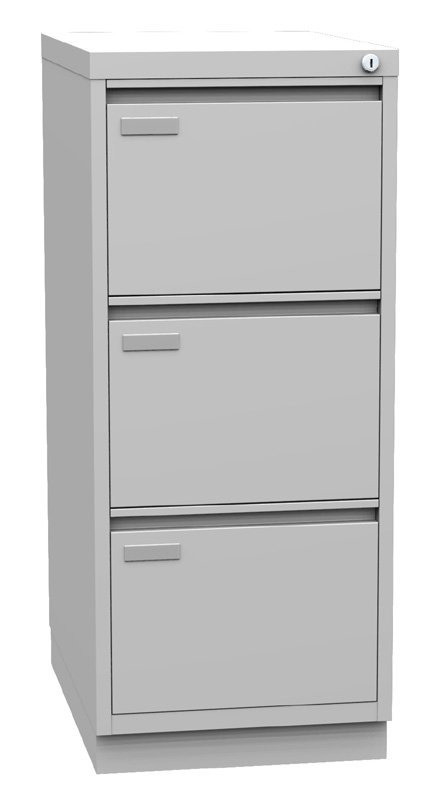 Metalowa szafka z trzema szufladami na dokumenty i segregatory wiszące w formacie A4. Wysokość 962, szerokość 404, głębokość 600 mm. Kolor korpusu RAL 7035 jasnoszary.