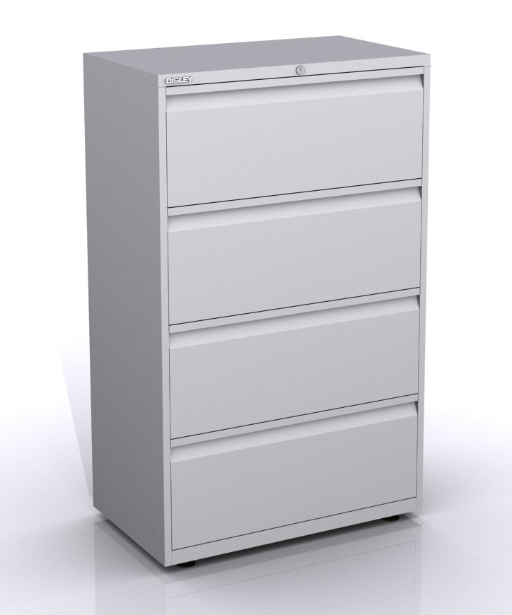 Wysokiej jakości szafka na dokumenty z czterema szufladami do przechowywania dokumentów w formacie A4 i Foolscap z indywidualnie zamykanymi szufladami. Szerokość 1000 mm, wysokość 1301 - 1325 mm, głębokość 470 mm. w zestawie podstawa do wyrównywania nierówności podłoża. Wykonane z blachy o grubości 0,9 mm.
