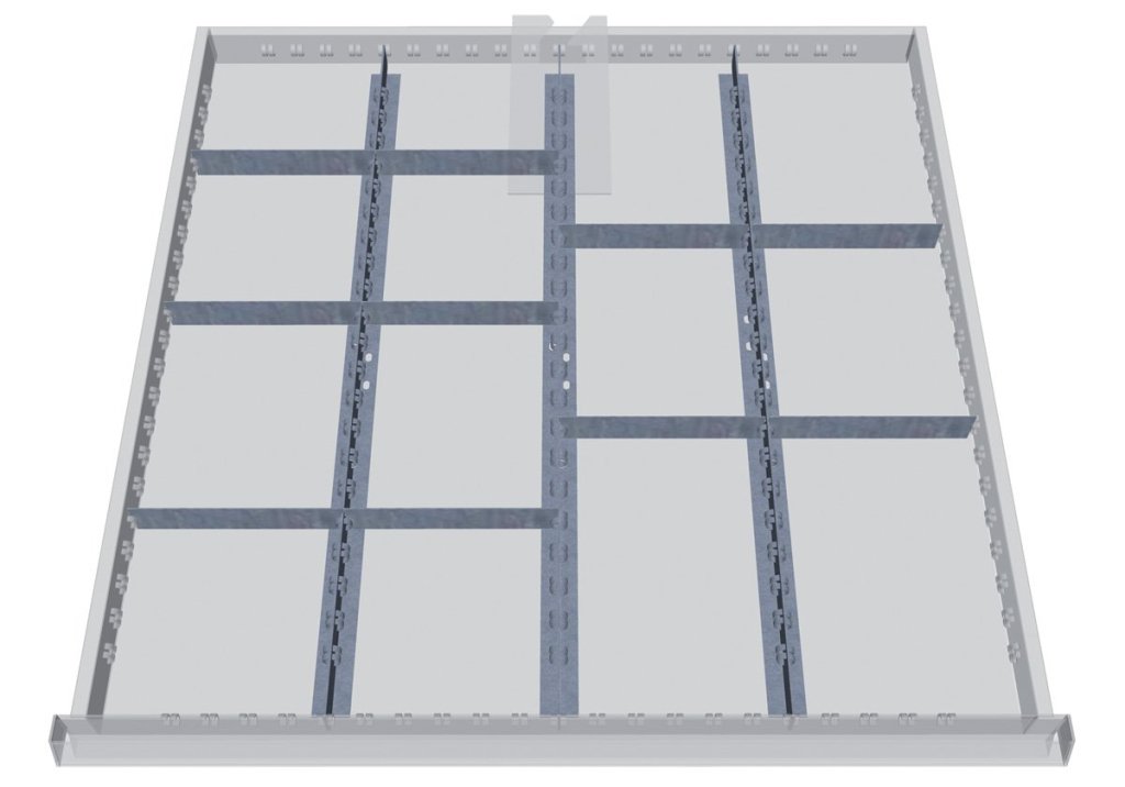 Zestaw plastikowych przegródek do szuflad o wysokości 50 - 75 mm. Pasuje wyłącznie do szafek z szufladami Bedrunka+Hirth o szerokości 705 i głębokości 736 mm.