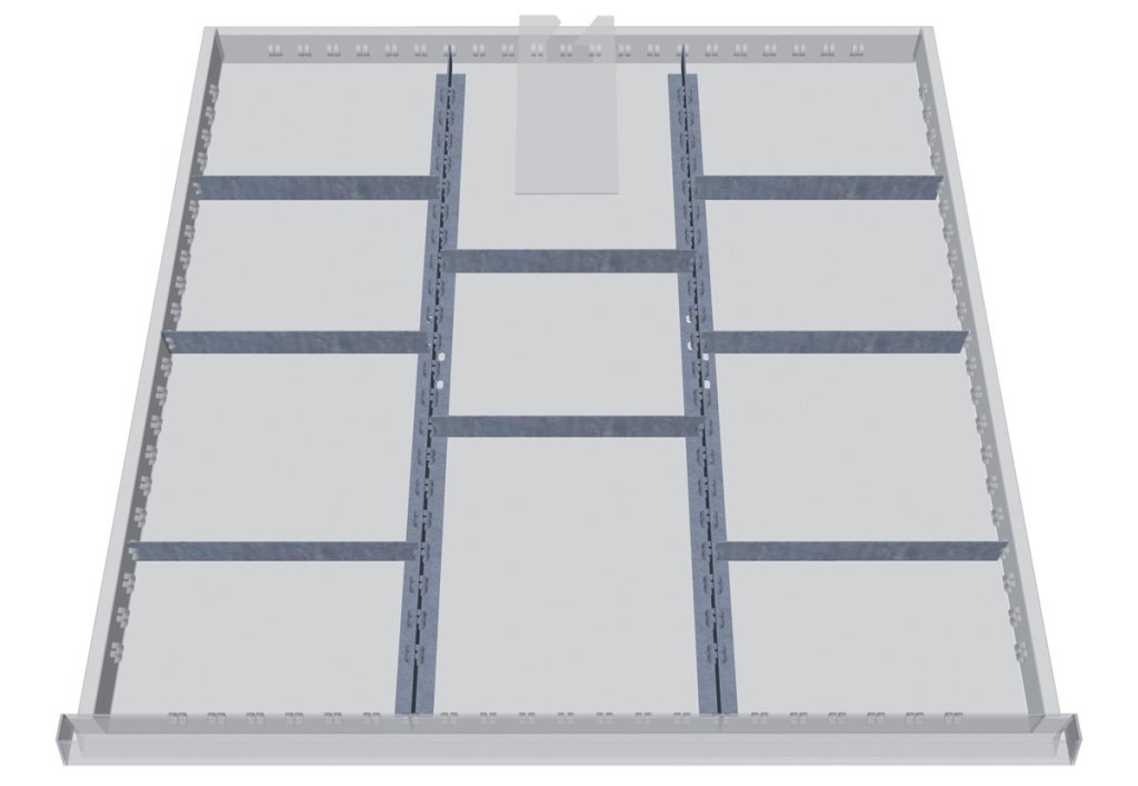Zestaw plastikowych przegródek do szuflad o wysokości 50 - 75 mm. Pasuje wyłącznie do szafek z szufladami Bedrunka+Hirth o szerokości 705 i głębokości 736 mm.