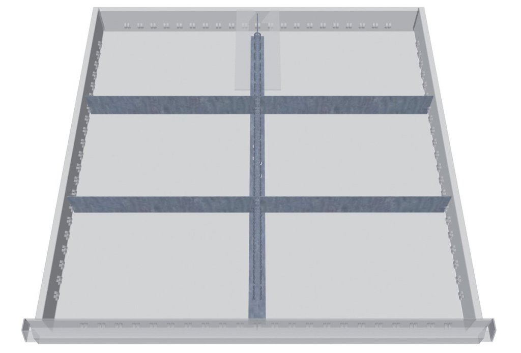 Zestaw plastikowych przegródek do szuflad o wysokości 50 - 75 mm. Pasuje wyłącznie do szafek z szufladami Bedrunka+Hirth o szerokości 705 i głębokości 736 mm.