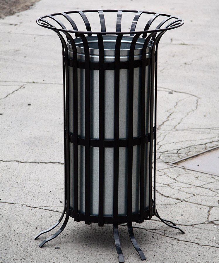 - solidny metalowy kosz na śmieci o ciekawym wyglądzie