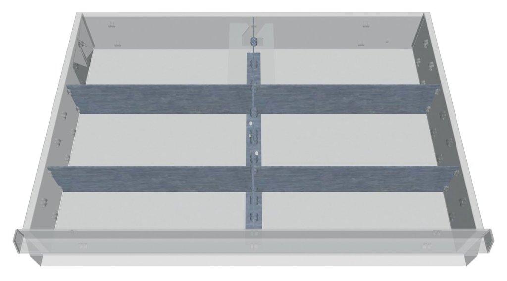 Metalowy podział na szuflady o wysokości 100 mm. Pasuje tylko do wózków serwisowych Bedrunka+Hirth o szerokości 680 i głębokości 500 mm.