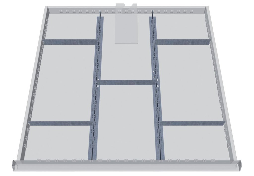 Zestaw plastikowych przegródek do szuflad o wysokości 50 - 75 mm. Pasuje wyłącznie do szafek z szufladami Bedrunka+Hirth o szerokości 705 i głębokości 736 mm.