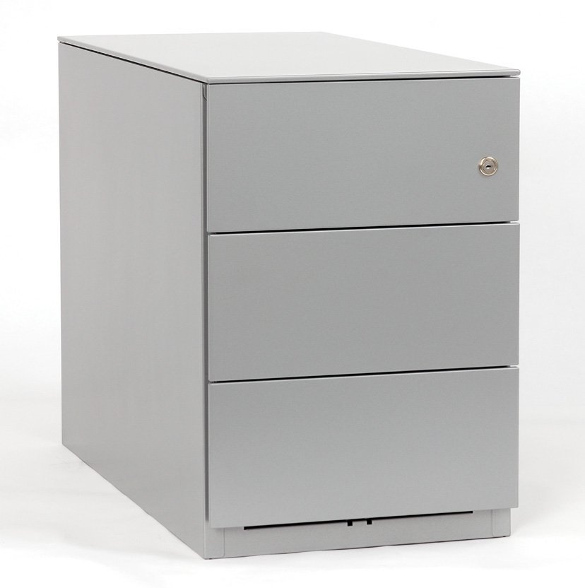 Kontener biurowy mobilny wąski, zamek centralny, 3x szuflada standardowa. Wysokość 495 lub 501, szerokość 300, głębokość 565 mm. Wariant bez płyty górnej lub z górną płytą dekoracyjną o grubości 6 mm. Wysuw szuflady 80 lub 100%.