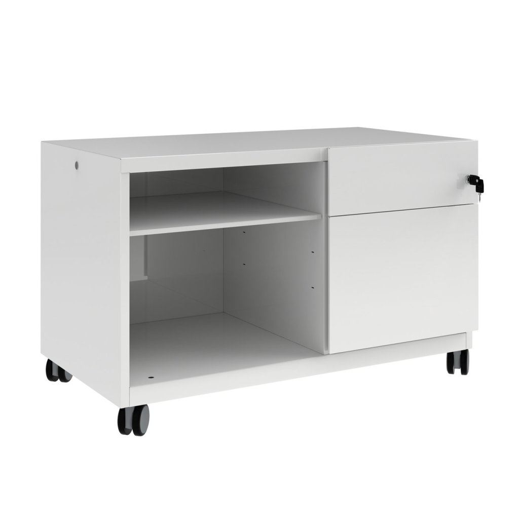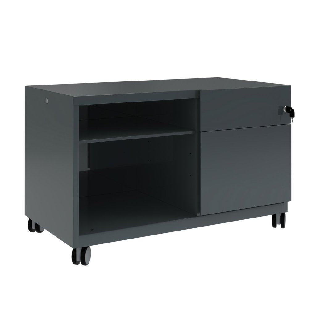 Przenośny kontener biurowy Caddy z kolekcji Be by Bisley wersja prawa. Wysokość 563 x szerokość 900 x głębokość 490 mm, kontener w standardzie jest na kółkach.