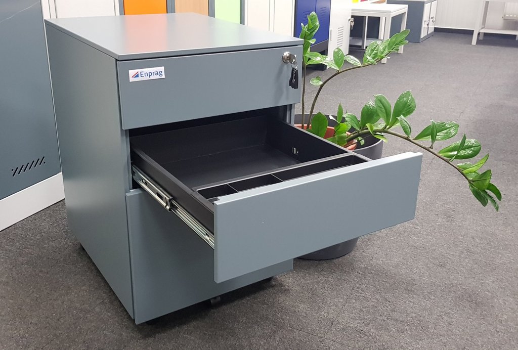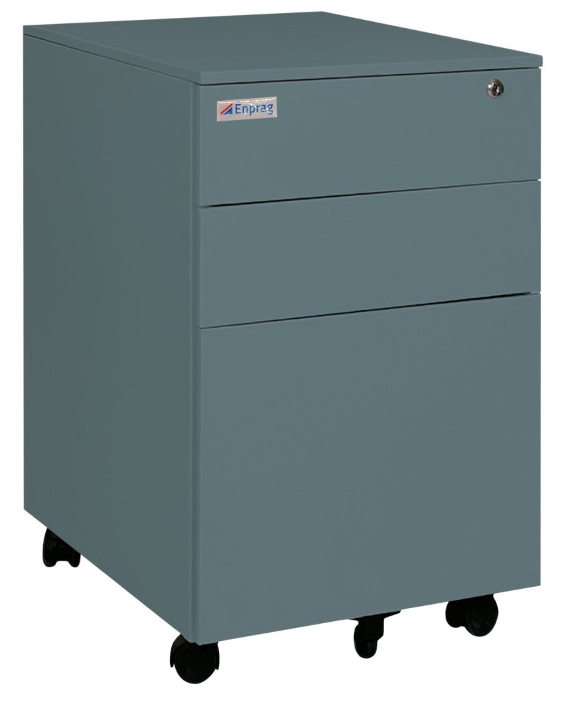 Przenośny kontenerek trzyszufladowy wykonany z blachy stalowej o grubości 0,6 mm. Wysokość 643 x szerokość 405 x głębokość 500 mm, zamek centralny. Wykończenie powierzchni szarą farbą proszkową RAL 7047.