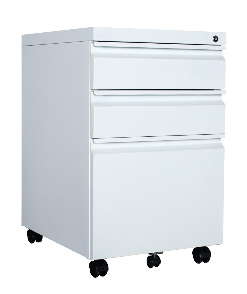 Przenośny kontenerek trzyszufladowy wykonany z blachy stalowej o grubości 0,6 mm. Wysokość 595 x szerokość 390 x głębokość 500 mm, zamek centralny. Obróbka powierzchni białą farbą proszkową.