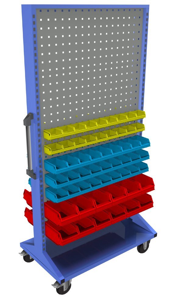 Ruchome panele dwustronne z wyposażeniem. Konstrukcja stojaka składa się z solidnej ramy z metalowymi perforowanymi ściankami do zawieszania plastikowych skrzynek i uchwytów na narzędzia. Rama malowana jest trwałą farbą proszkową, panele perforowane są ocynkowane lub malowane trwałą farbą proszkową. Panele wyposażone są w uchwyt prowadzący oraz cztery kółka (2 x stałe, 2 x skrętne z hamulcem).