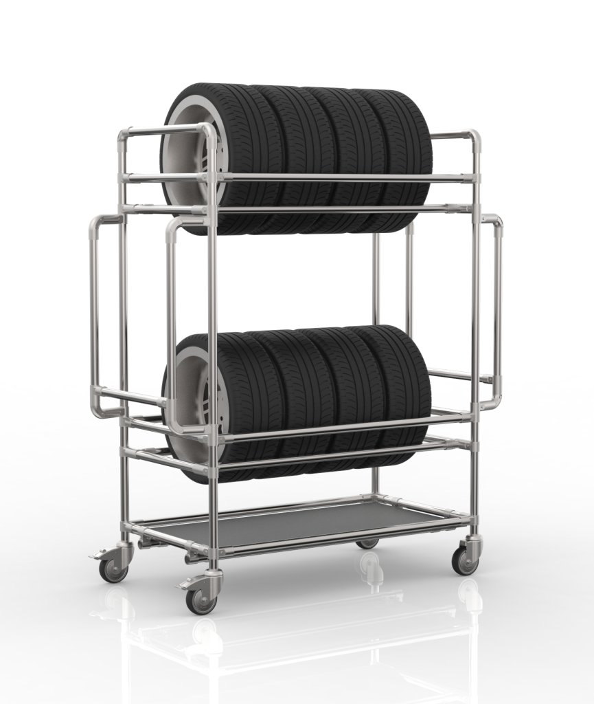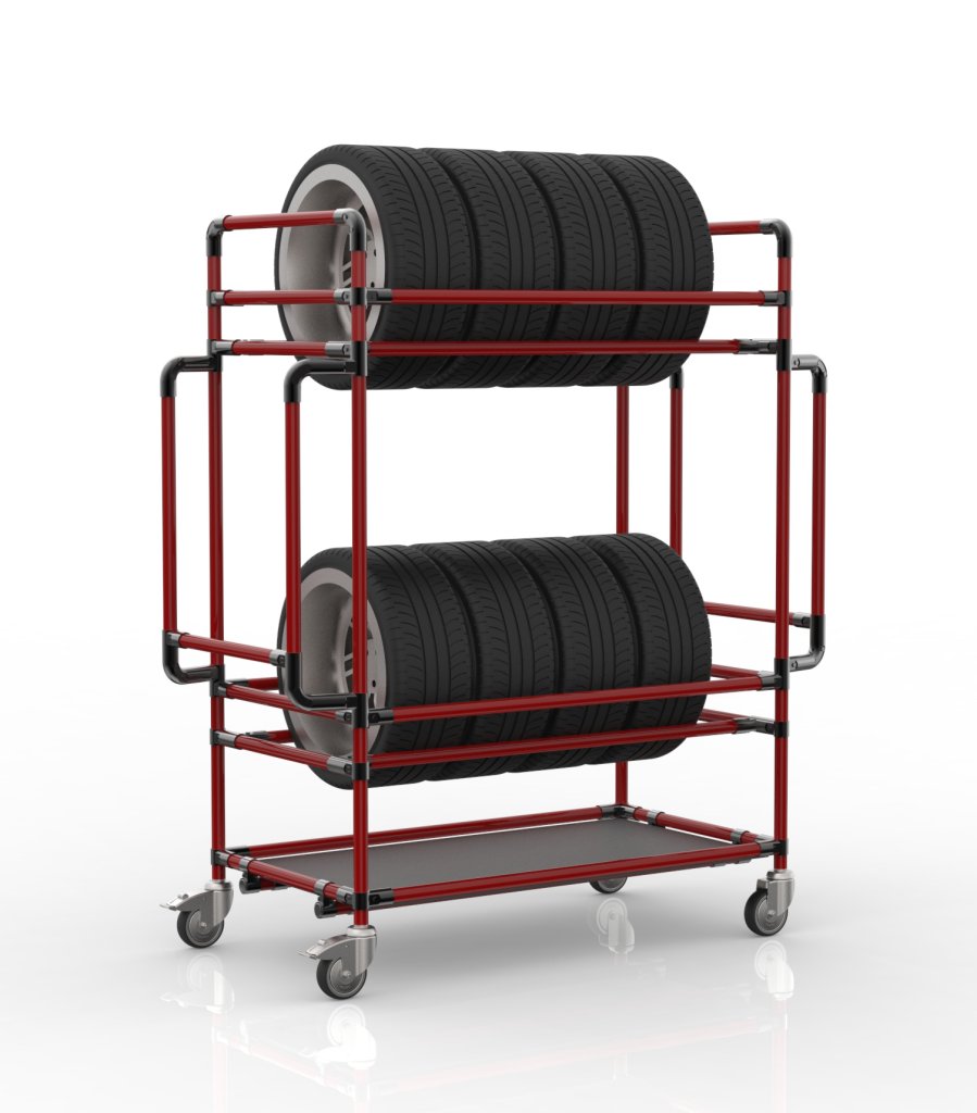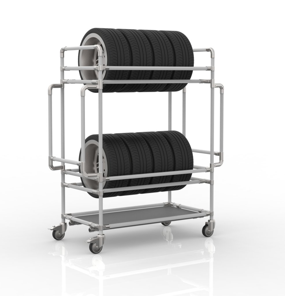 Wózek na opony wykonany z systemu modułów rurkowych, z praktycznym uchwytem. Idealny do opon o rozmiarach 16" - 20". 2 kółka skrętne i 2 skrętne z hamulcem, średnica: 100 mm. Opony nie są częścią zestawu. Nośność wózka: 100 kg. Wymiary: 700 x 1066 x 596 mm.