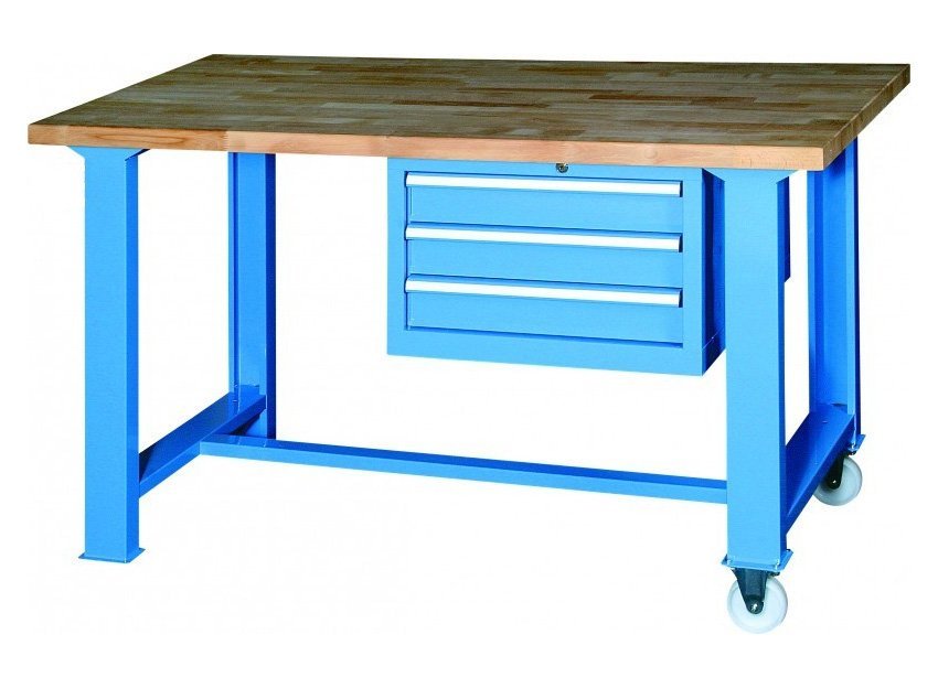 Mobilny stół roboczy z 2 kółkami, szerokość 1500 mm, głębokość 700 mm, wysokość 880 mm. 2x stałe koło polipropylenowe 125 mm, nośność stołu 250 kg. Blat bukowy multiplex o grubości 40 mm, szafka podwieszana z 3 szufladami i zamkiem centralnym, wysokość szafki 390 mm. Typ ZA39-3, wysokość frontu 3x 100 mm, wymiary wewnętrzne szuflady 459 x 459 mm (27 x 27D).