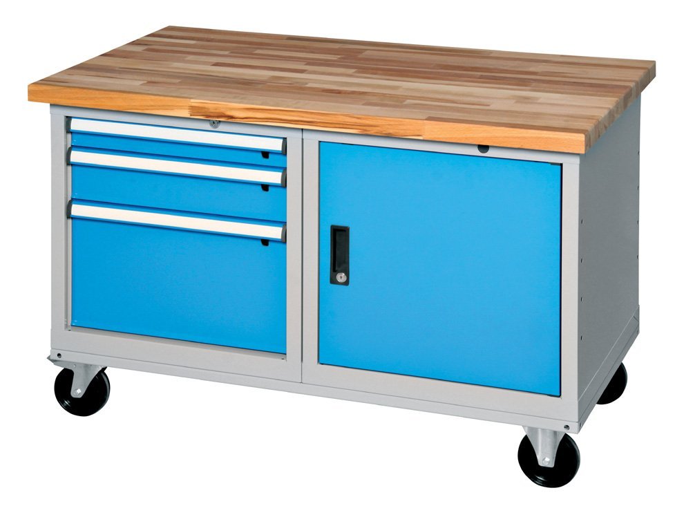 Mobilny stół warsztatowy, blat 1200 x 700 x 40 mm, wysokość stołu 810 mm. Łączenie blatu buk o grubości 40 mm lub buk multipleks (oznaczenie M - fornir bukowy warstwowy) - grubość 40 mm. Nośność stołu 380 kg.