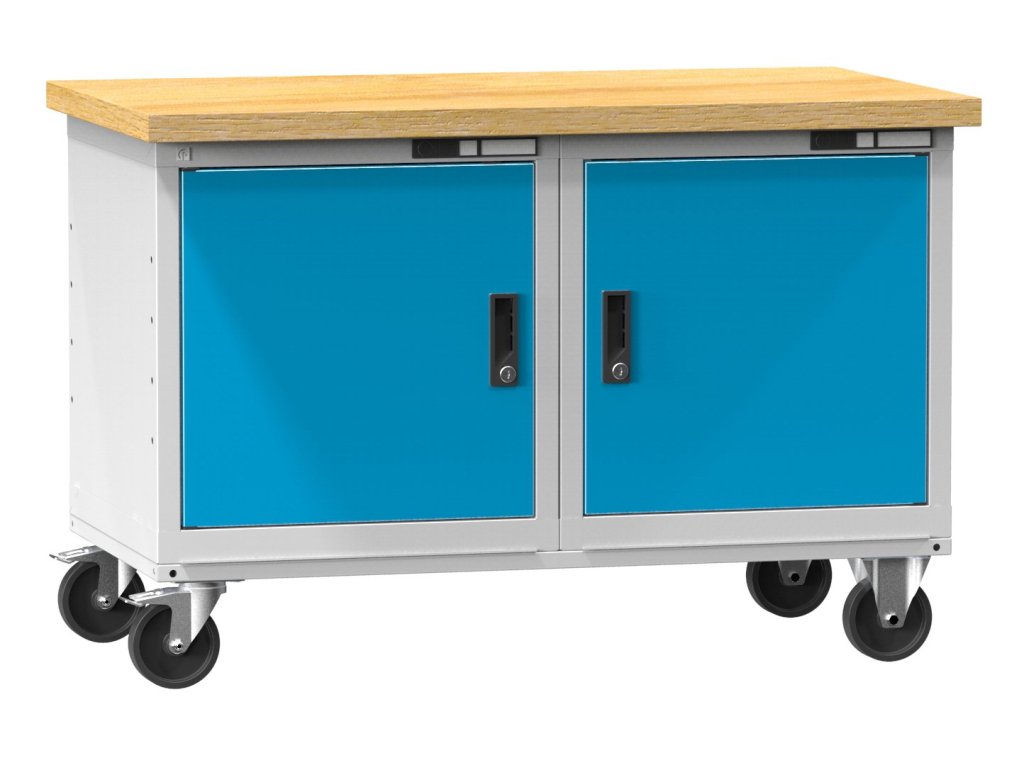 Mobilny stół warsztatowy, blat 1200 x 700 x 40 mm, wysokość stołu 810 mm. Łączenie blatu buk o grubości 40 mm lub buk multipleks (oznaczenie M - fornir bukowy warstwowy) - grubość 40 mm. Nośność stołu 380 kg.