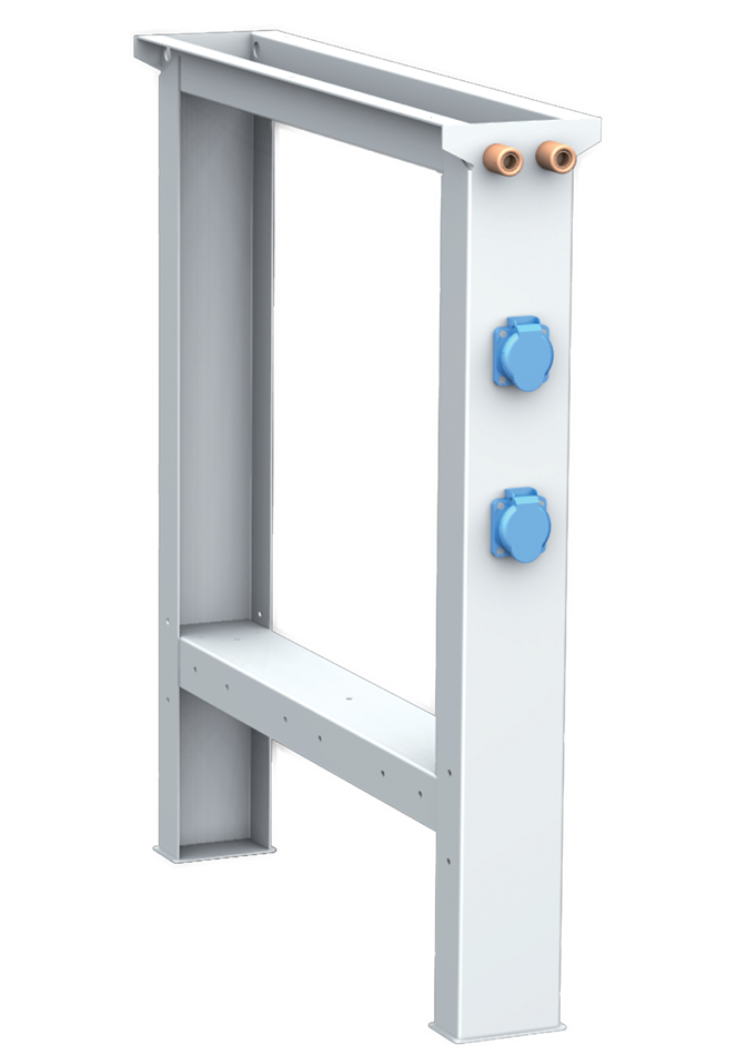 Noga z dwoma gniazdami elektrycznymi 230V/16A i dwoma szybkozłączami do podłączenia powietrza. Wysokość 810 mm, szerokość 150 mm, głębokość 699 mm, kolor jasnoszary RAL 7035.