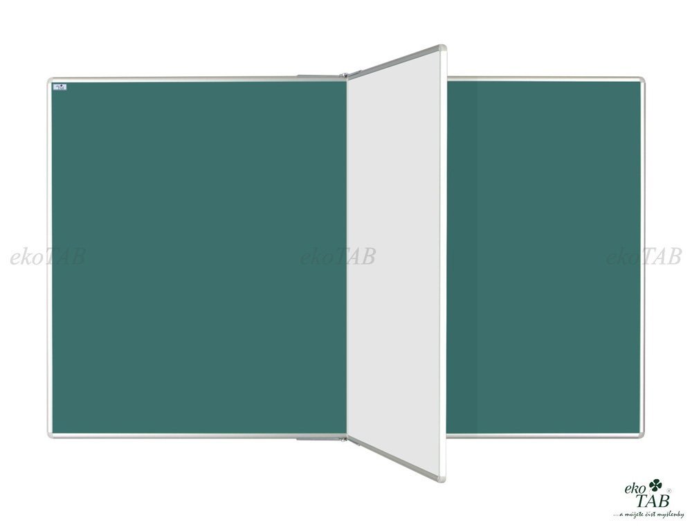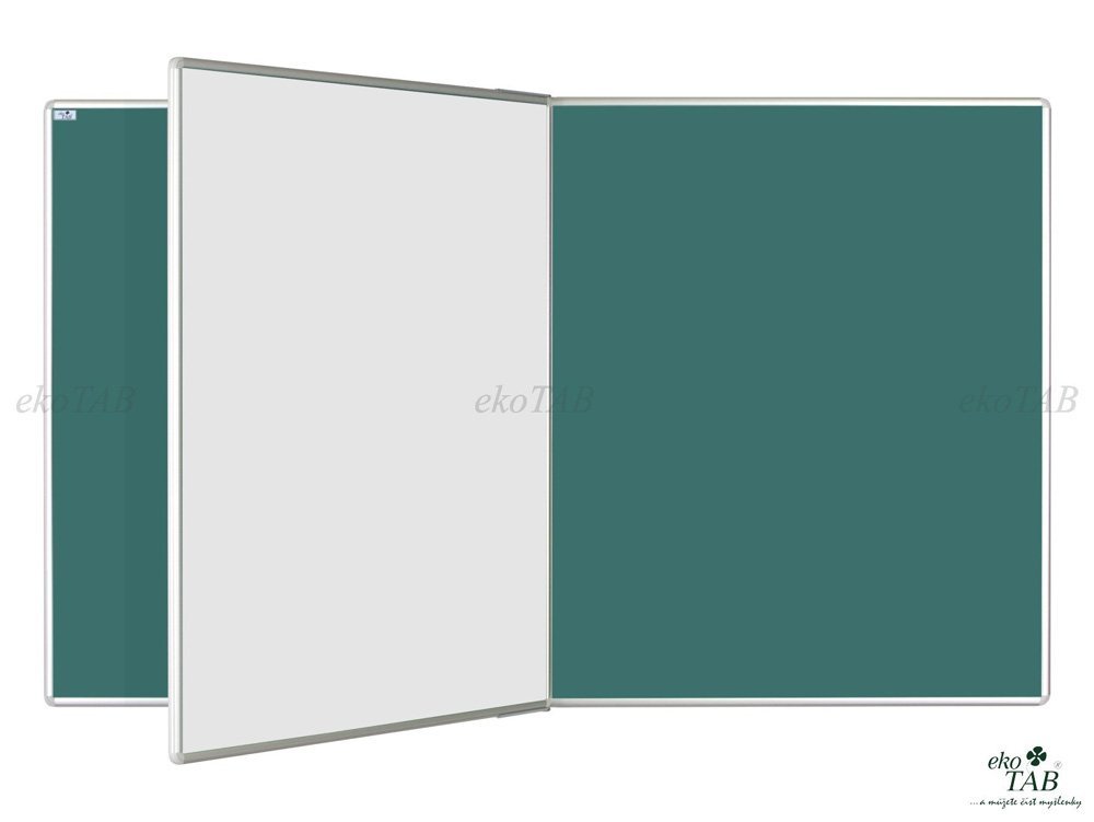 Tablica ceramiczna magnetyczna z centralnym skrzydełkiem obrotowym. Rama aluminiowa anodowana w naturalnym odcieniu, narożniki plastikowe. Powierzchnia łączona do pisania kredą w kolorze zielonym, do pisania markerem w kolorze białym. Dostarczany z zestawem do montażu na ścianie. Wymiary wysokość 120 x szerokość 240 cm. Można przymocować do ściany, stojaka podnoszącego AL lub PYLON AL.