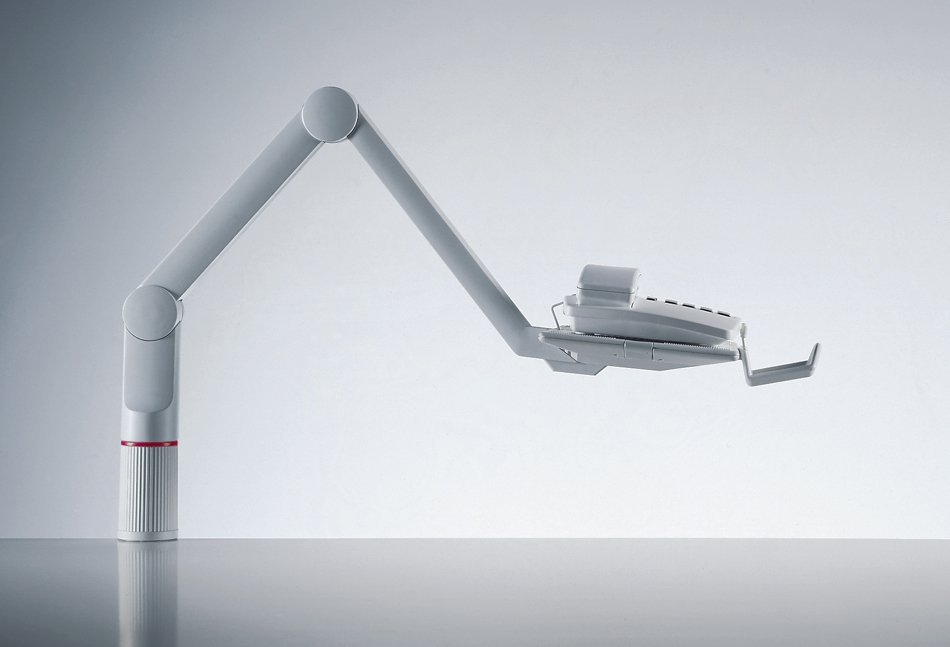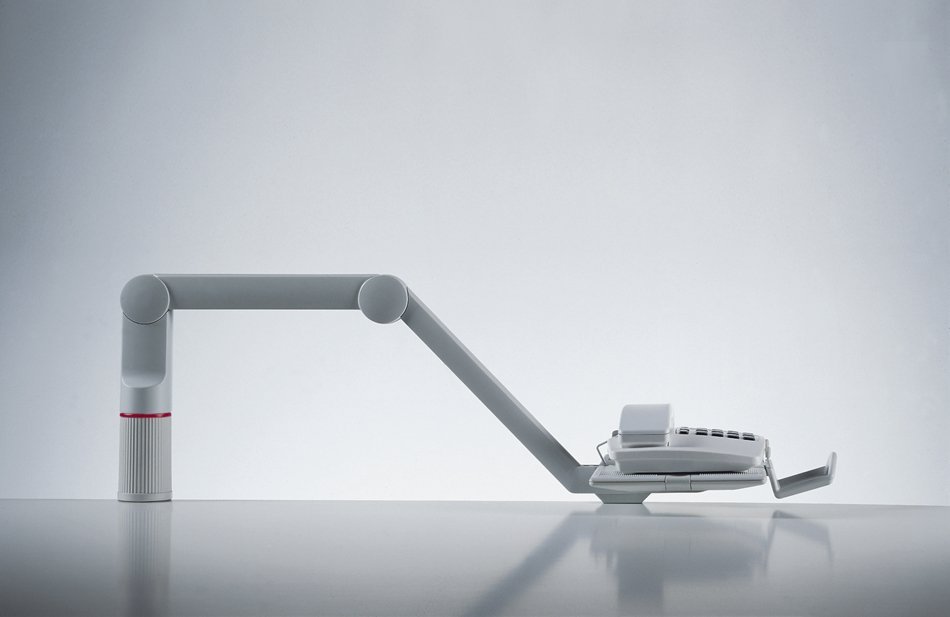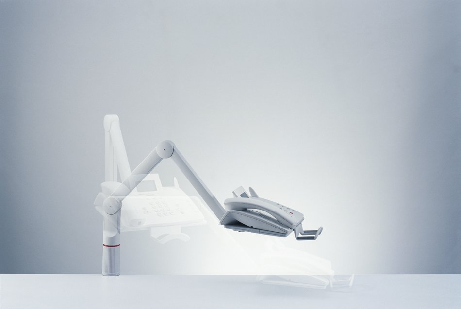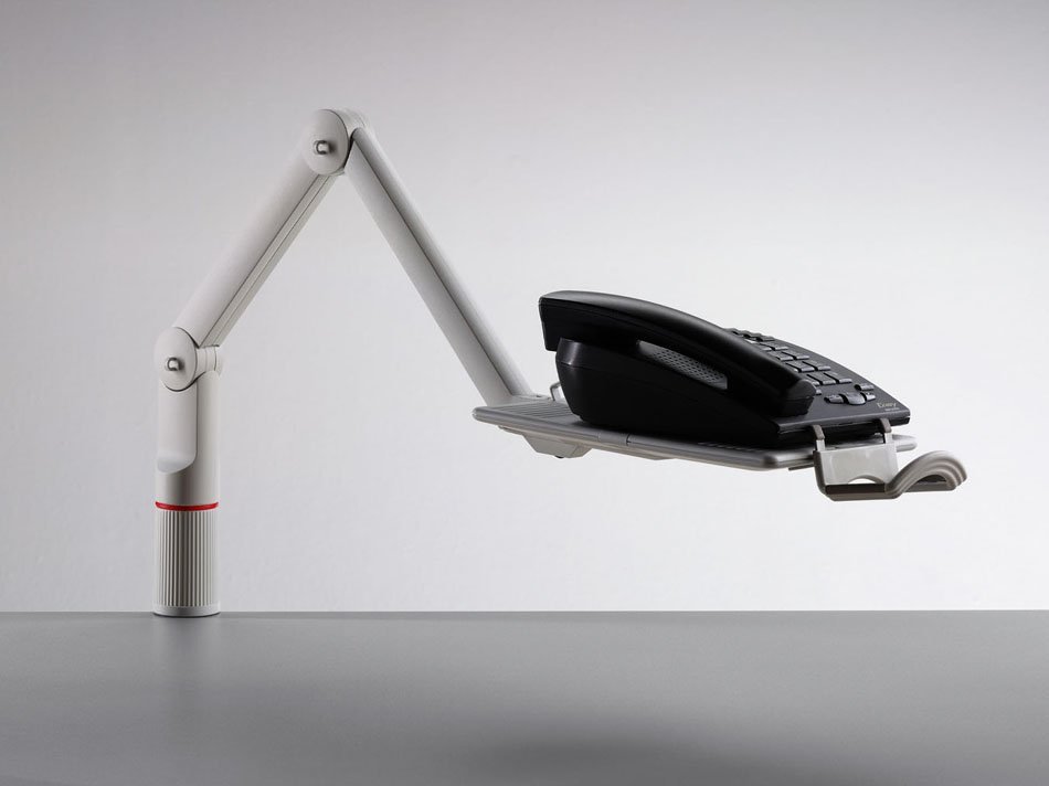 Obrotowy stojak na telefon z dwuczęściowym przegubowym ramieniem, regulowanym w trzech pozycjach. Uniwersalne mocowanie do krawędzi blatu stołu o grubości 18-74 mm. Nośność 2 kg. Wysokość nad stołem 0-210 mm, wymiary płyty 172 x 258 mm, promień roboczy 490-780 mm. Gwarancja 2 lata.