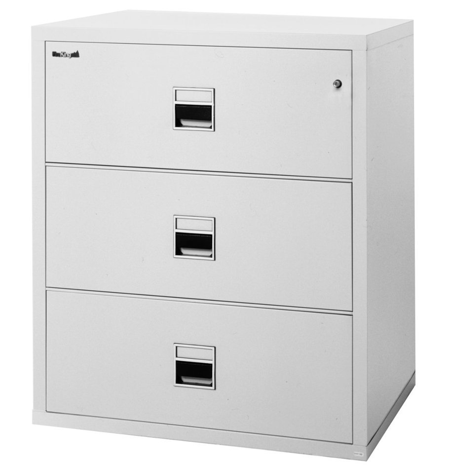 Szafa kartotekowa ognioodporna Fireking typu UF-3. Wysokość 1103 x szerokość 539 x głębokość 800/813 mm. Badanie odporności ogniowej 60 minut, dla typu UF-3-2H 120 minut. Kolor jasnoszary RAL 7035.