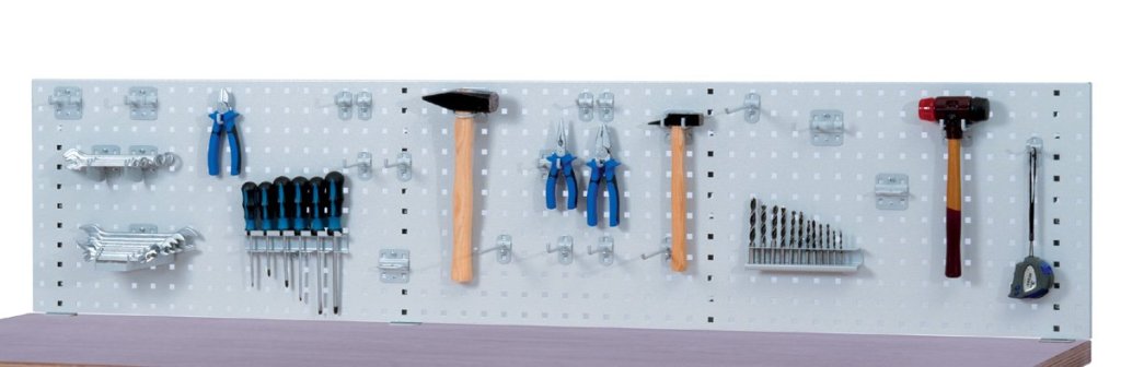 Panel perforowany do zawieszania uchwytów narzędziowych na stołach warsztatowych i deskach o szerokości 1500 mm. Szerokość panelu 1500, wysokość 450 mm.
