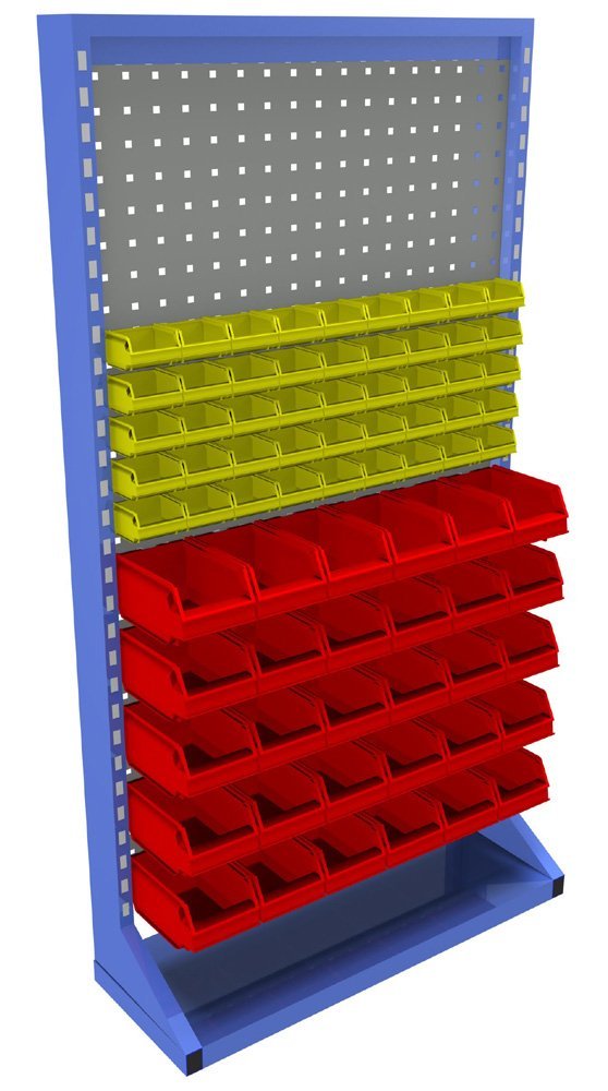 Stacjonarne panele jednostronne z wyposażeniem. Konstrukcja stojaka składa się z solidnej ramy z metalowymi perforowanymi ściankami do zawieszania plastikowych skrzynek i uchwytów na narzędzia. Rama malowana jest trwałą farbą proszkową, panele perforowane są ocynkowane lub malowane trwałą farbą proszkową.
