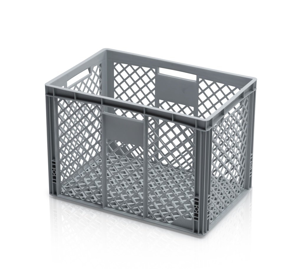 Skrzynia europejska z możliwością układania w stosy, odpowiednia do długotrwałego przechowywania i produkcji. Jest stabilny w transporcie, kompatybilny z europaletami. Posiada solidne dno i boki z zamykanymi uchwytami. Kolor szary. Pojemność 67 l.