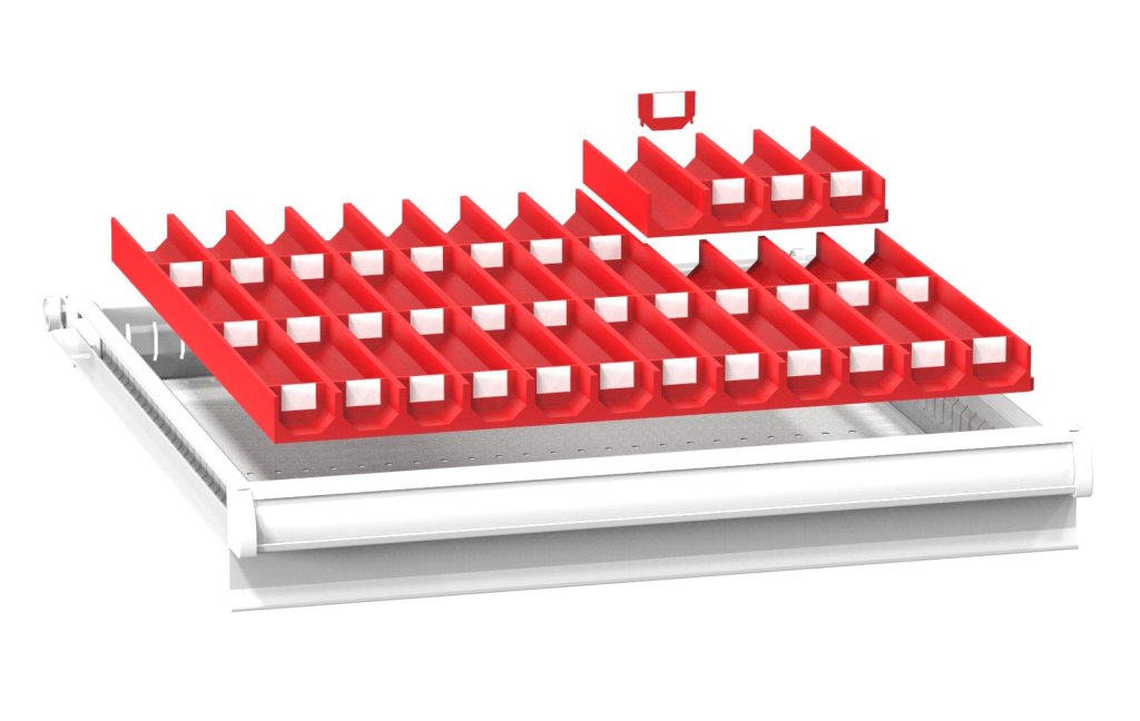 Plastikowe przegródki do szuflad serii ZA, 9x prowadnica czteroczęściowa, szerokość szyny 33 mm, 36x przegroda, waga 1,2 kg. pełny opis i parametry