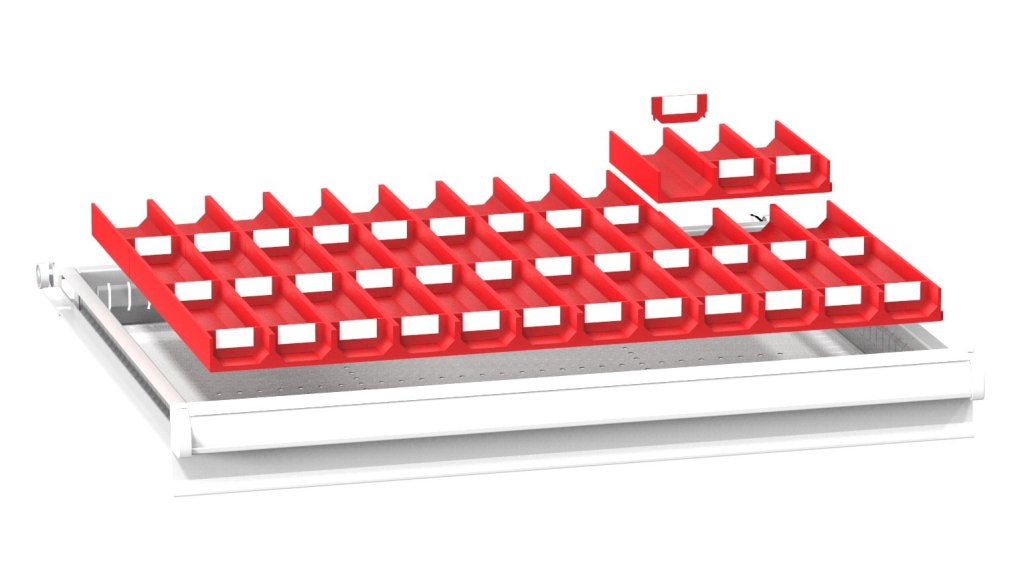 Plastikowe przegródki do szuflad serii ZD, 12x korytko trzyczęściowe, szerokość korytka 45 mm, 24x przegroda, waga 1,3 kg.