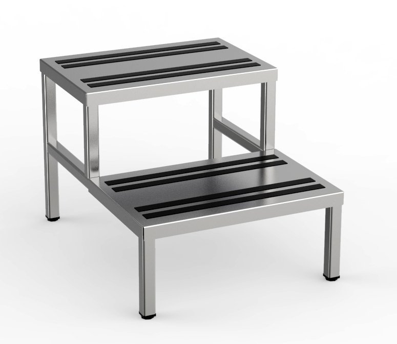 Podest dwustopniowy ze stali nierdzewnej z powierzchnią antypoślizgową. Stopy nie pozostawiają smug na podłodze. Wysokość 430 mm, szerokość 500 mm, głębokość 650 mm.