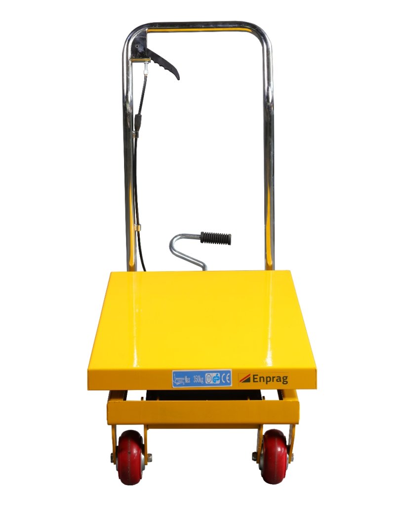 Platforma nożycowa wyposażona w nożną pompę hydrauliczną o udźwigu 350 kg i maksymalnej wysokości podnoszenia 900 mm. pełny opis i parametry