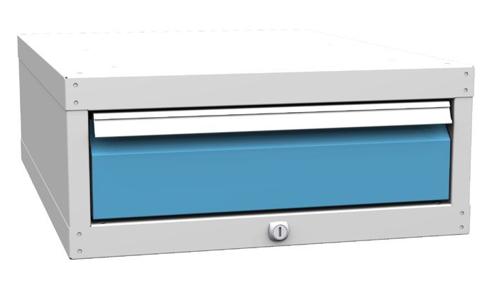 Szuflada biurka zawieszana, szerokość 500, wysokość 212, głębokość 700 mm. 1 x nasadka 120 mm. Kolor korpusu RAL 7035 jasnoszary. Na stanie w szufladzie w kolorze niebieskim.