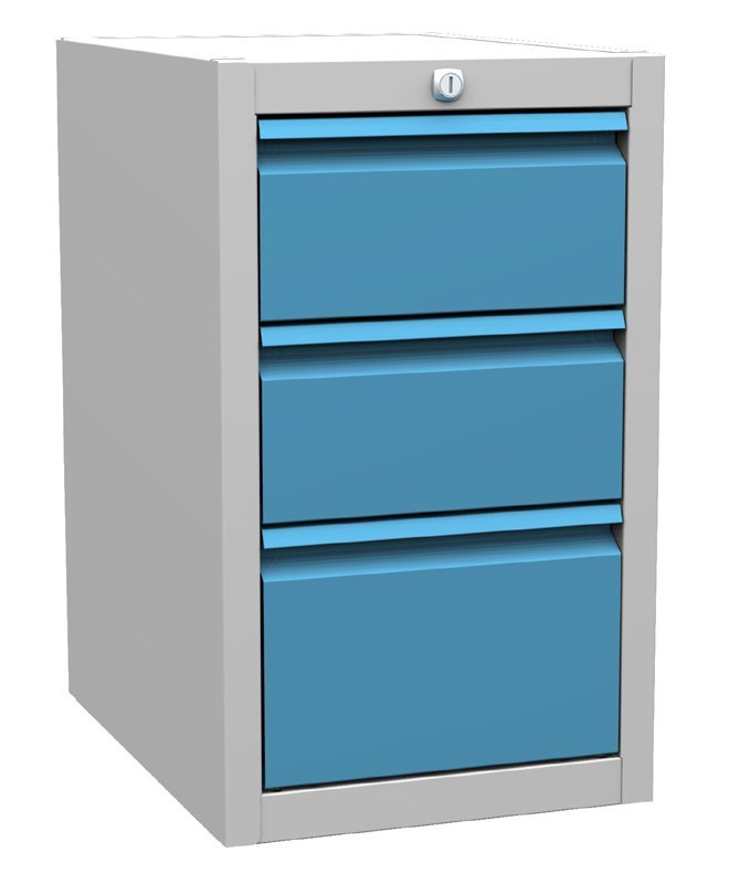 Pojemnik podwieszany z trzema szufladami do stołów MTS, szerokość 360, wysokość 600, głębokość 500 mm. Kolor korpusu RAL 7035 jasnoszary.