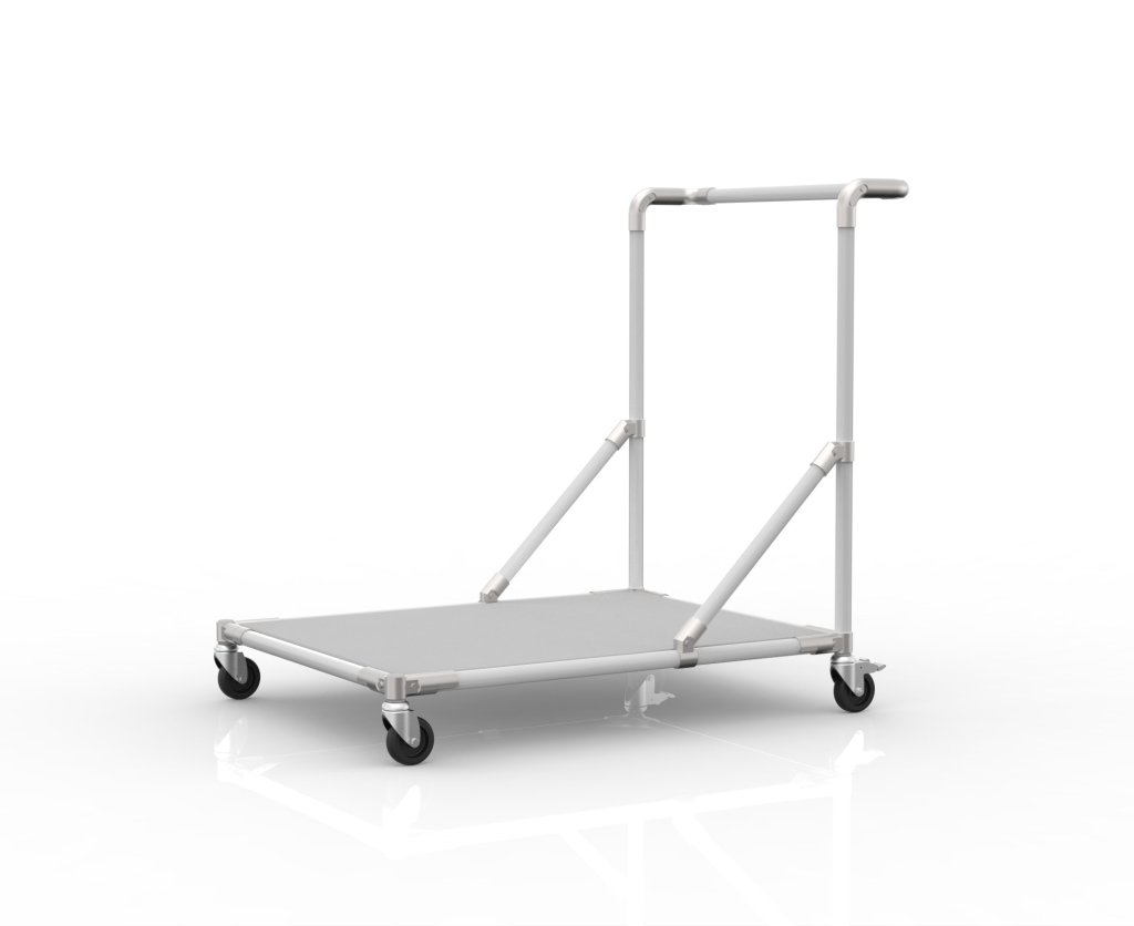 Podwozie manipulacyjne wykonane ze zmontowanych elementów stalowych o wymiarach 40x40 mm. Dzięki nośności do 750 kg idealnie nadaje się do transportu cięższych przedmiotów. 2 koła skrętne z hamulcem i 2 skrętne bez hamulca o średnicy 125 mm. Podwozie dostępne jest w kilku wariantach – powierzchnia ocynkowana lub kolorowy lakier. Wymiary 350 x 840 x 1350 mm.