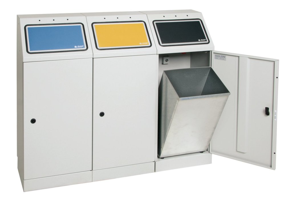 Pojemnik do segregacji odpadów, metalowy, o wymiarach - wysokość 1000 x szerokość 1210 x głębokość 300 mm. Cała konstrukcja posiada powierzchnię ocynkowaną. Zamknięcie posiada solidne osłony w 3 kolorach dla wyróżnienia. Klapy są zawsze otwarte – odpady można wrzucać bez dotykania kosza. Kosz posiada zamykane drzwiczki z przodu oraz wyjmowane kosze wewnętrzne 3x 45 l. Dwie regulowane nóżki wyrównujące nierówności podłoża. Piktogramy nie są częścią dostawy.