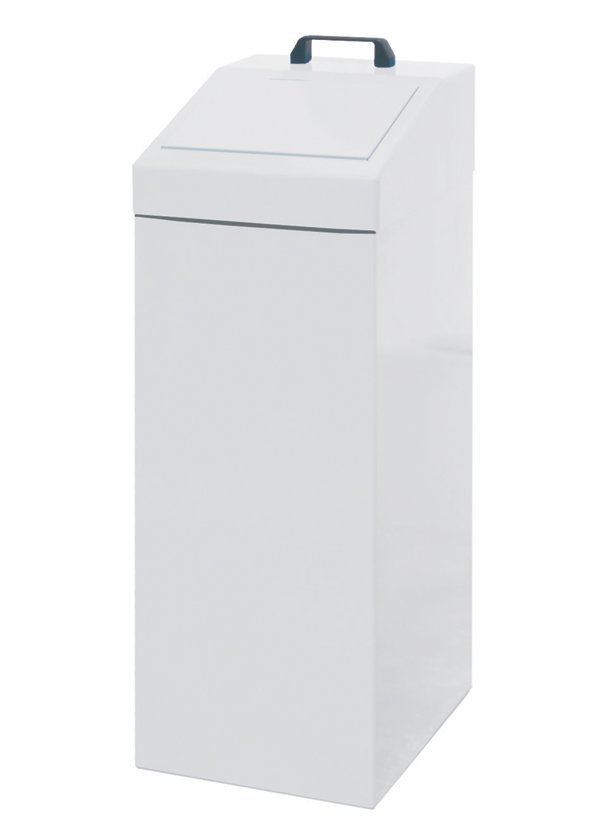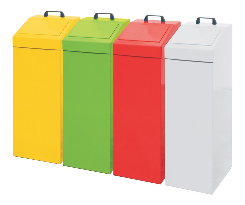 Metalowy pojemnik na odpady sortowane w różnych kolorach. Wysokość 950 x szerokość 335 x głębokość 380 mm. Samozamykająca się klapa wpuszczana, zdejmowana pokrywa. Proszę użyć worka PE o pojemności 100 l.