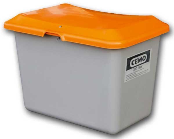 Pojemnik na piasek i sól z laminatu szklanego o pojemności 200 litrów. Kolor pojemnika jest szary, kolor pokrywki jest pomarańczowy. 10 lat gwarancji. Wymiary w mm (wys. x szer. x gł.) 690 x 890 x 600. Bez otworu do wysypu, z kieszeniami do prowadzenia wideł wózka paletowego. Dostawa w ciągu 5 dni.