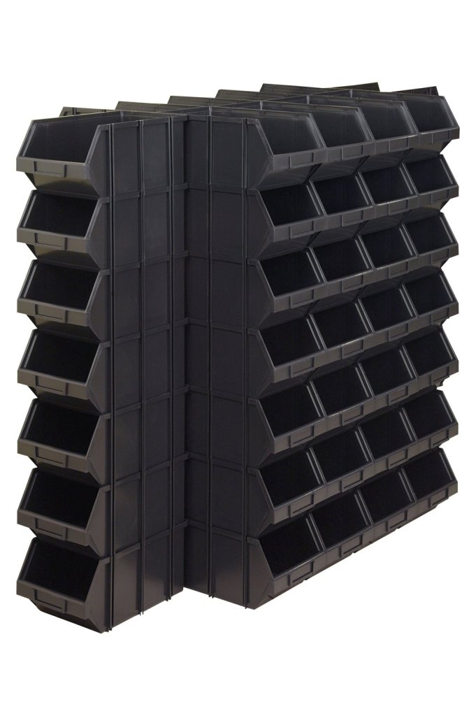 Pojemnik z tworzywa sztucznego Modulbox 4.1, wysokość 190, szerokość 310, głębokość 490 mm. Pudełka pasują do siebie. Kolor czarny.