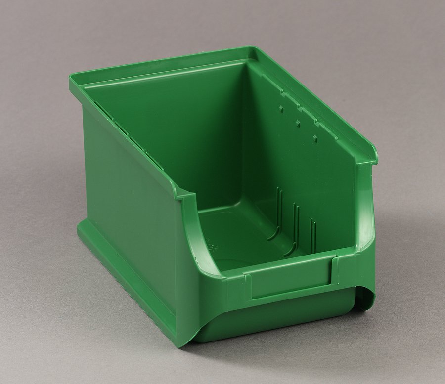 Plastikowy pojemnik w kolorze zielonym. Wymiary zewnętrzne - wysokość 125, szerokość 150, głębokość 235 mm, wymiary wewnętrzne - wysokość 105, szerokość 119, głębokość 189 mm.
